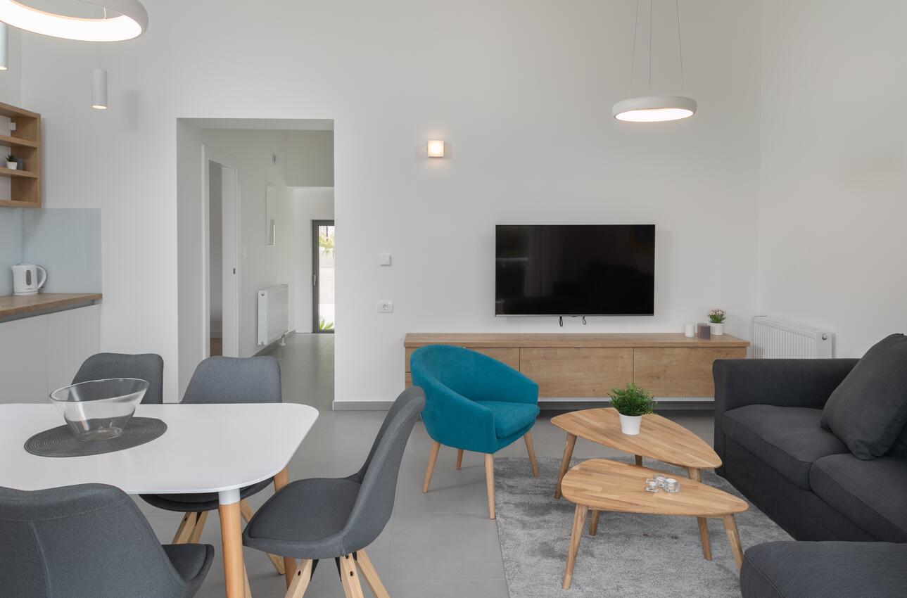 Ferienwohnung bietet Platz für 6 Gäste. Die Betten sind in Schlafzimmern, die es 2 gibt, und in Wohnzimmer, innerhalb einer Gesamtfläche von 52m2, angeordnet. Die Gäste haben einen eigenen Balkon zur Verfügung, auf der sie in warmen Sommernächten genießen können. Das Apartment bietet Meerblick. Es ist erlaubt, Speisen auf dem Gemeinschafts-Grill vorzubereiten. Während ihres Aufenthalts können Gäste das gemeinsam zur Nutzung stehende Schwimmbad benutzen. In der Unterkunftseinheit besteht die Möglichkeit des Mitbringens von Haustieren gegen Aufpreis.