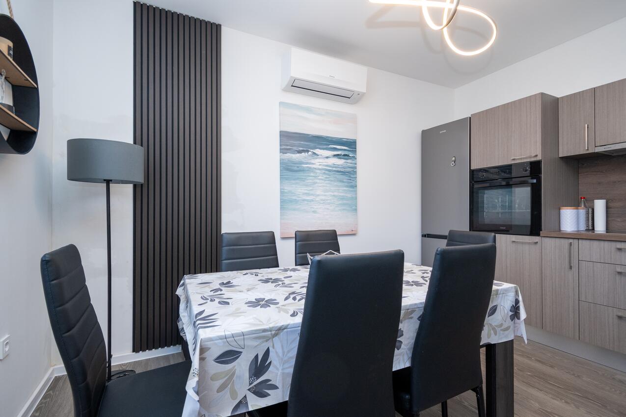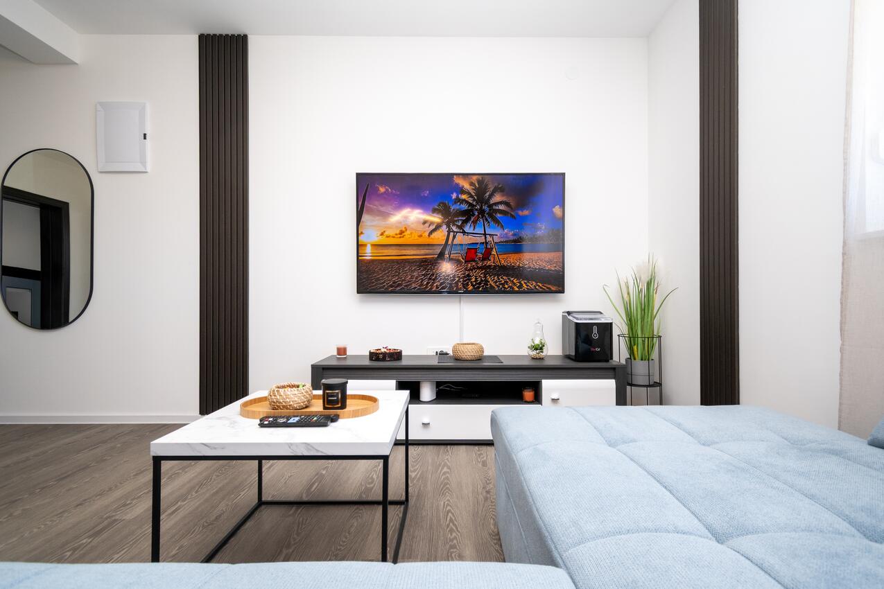 Ferienwohnung bietet Platz für 5 Gäste. Die Betten sind in Schlafzimmern, die es 2 gibt, und in Wohnzimmer, innerhalb einer Gesamtfläche von 54m2, angeordnet. Die Gäste haben eine eigene Terrasse zur Verfügung, auf der sie in warmen Sommernächten genießen können. Das Apartment bietet Meerblick. Während ihres Aufenthalts können Gäste das gemeinsam zur Nutzung stehende Schwimmbad benutzen.