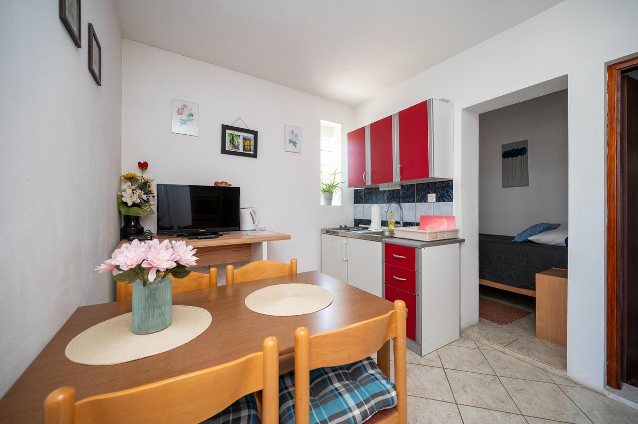 Studio bietet Platz für 5 Gäste. Die Betten sind in Schlafzimmern, die es 2 gibt, und in Wohnzimmer, innerhalb einer Gesamtfläche von 28m2, angeordnet. Die Gäste haben eine eigene Terrasse zur Verfügung, auf der sie in warmen Sommernächten genießen können. Es ist erlaubt, Speisen auf dem Gemeinschafts-Grill vorzubereiten. In der Unterkunftseinheit besteht die Möglichkeit des Mitbringens von Haustieren gegen Aufpreis.