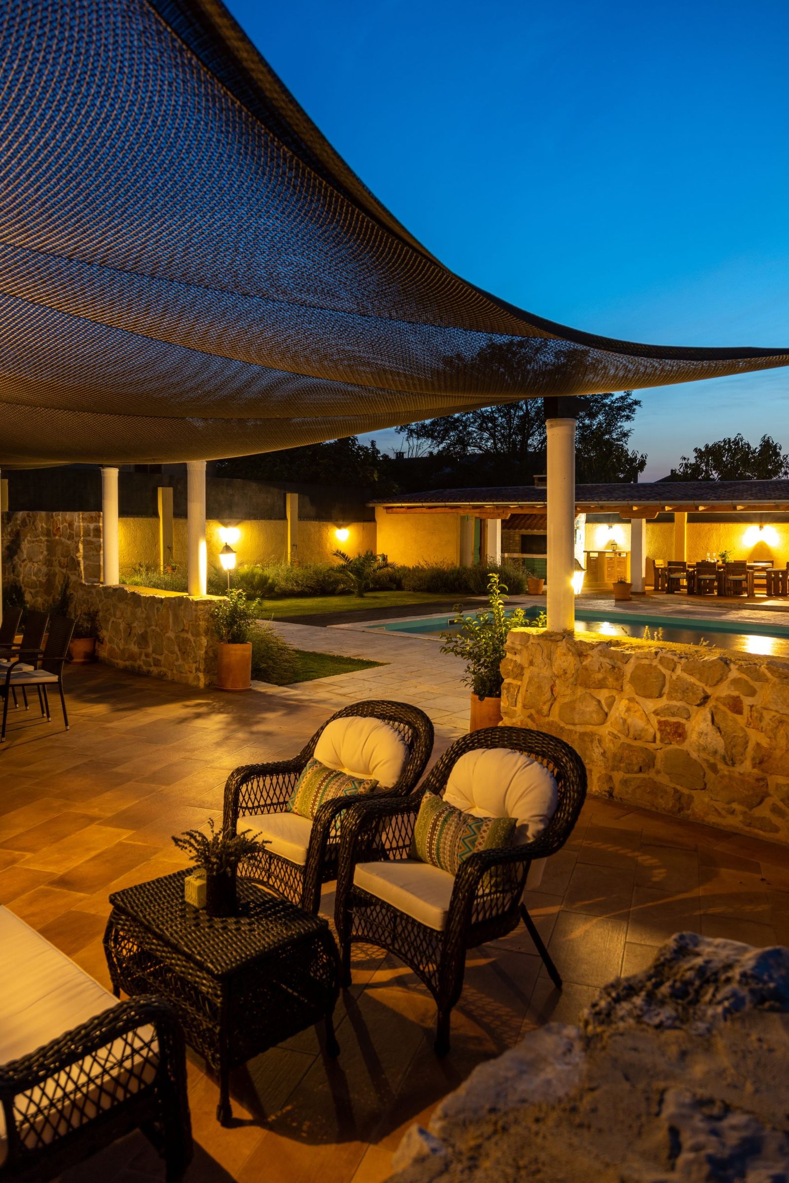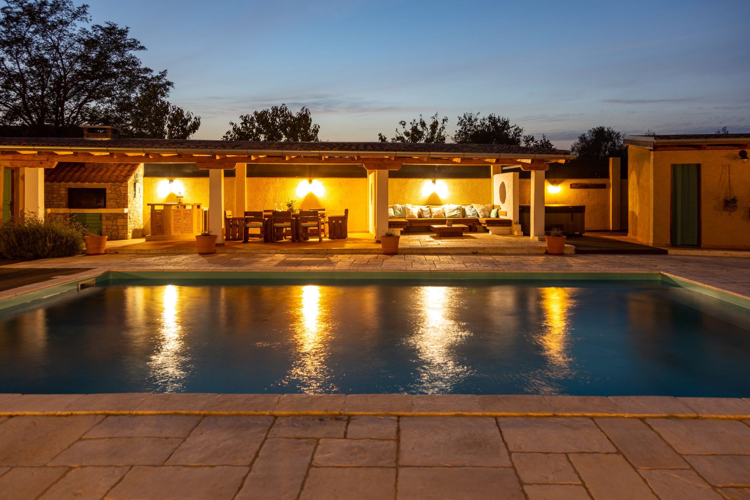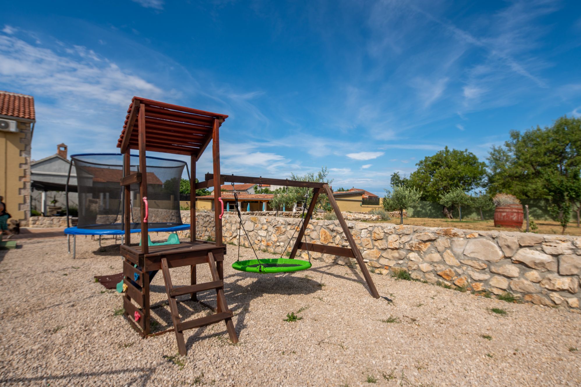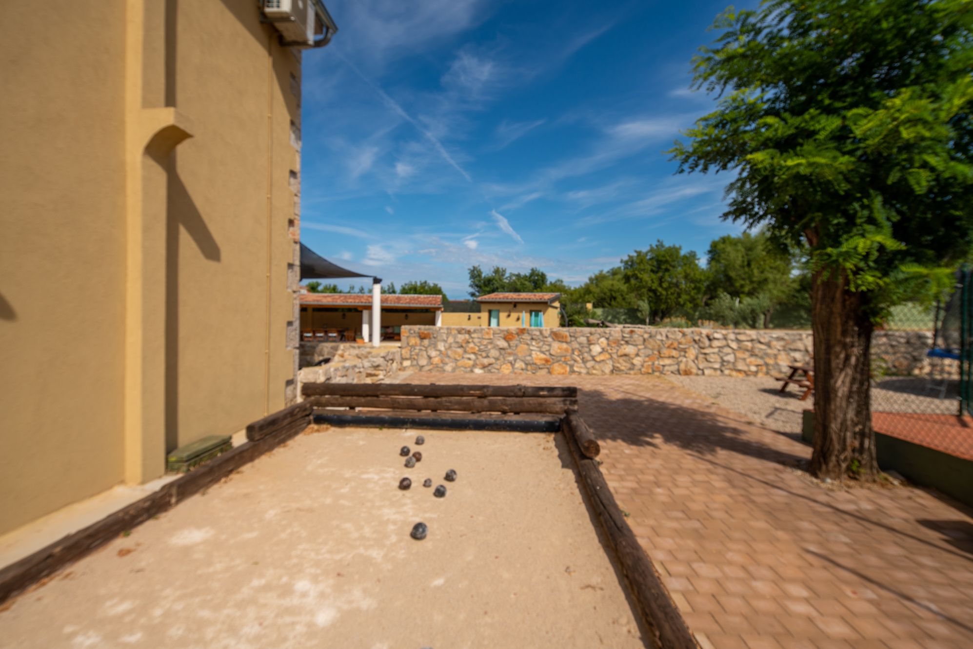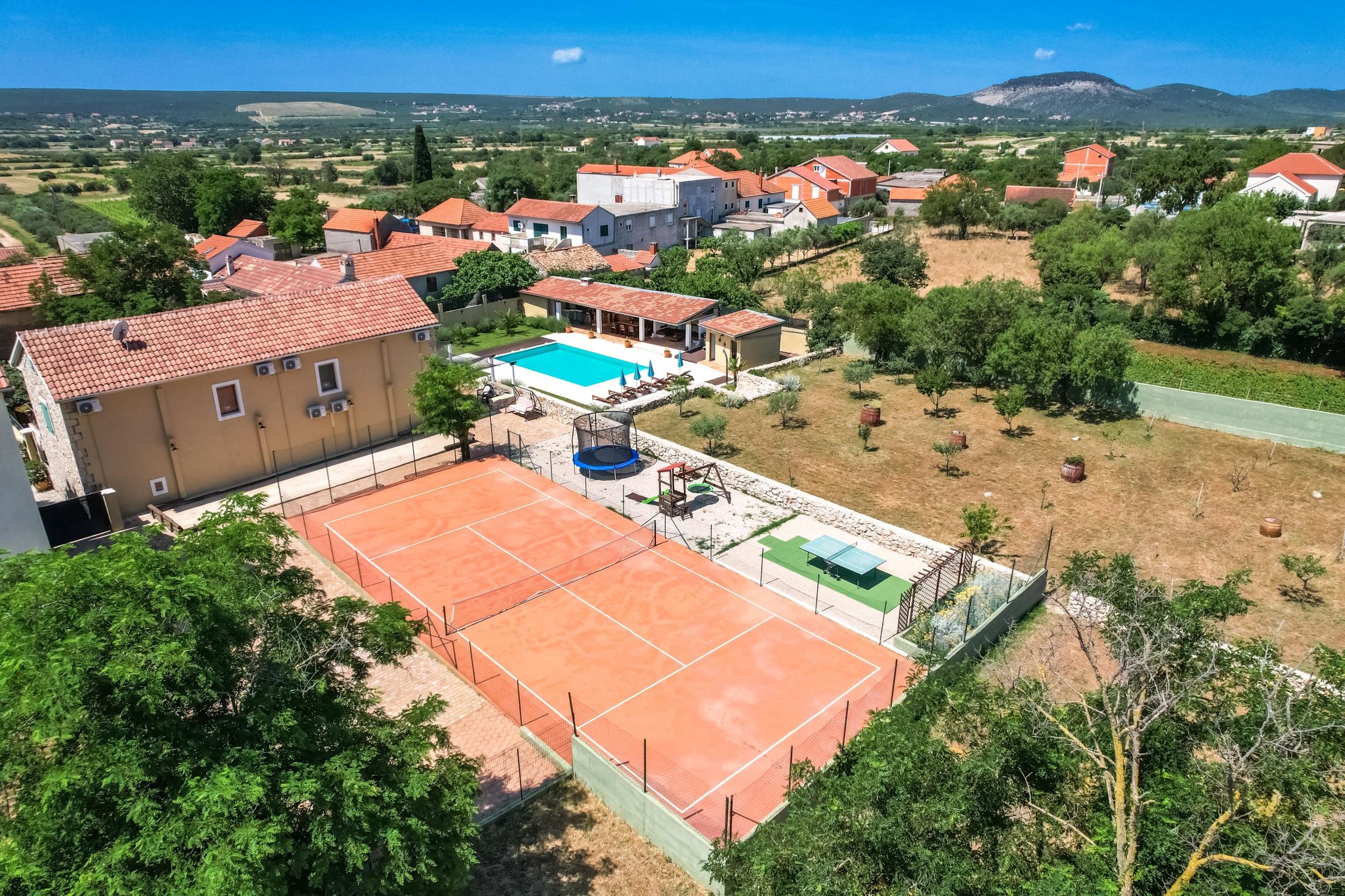 Villa Božini Dvori ist eine wunderschöne Villa im kleinen Örtchen Gornje Raštane, ca. 13 km von der Stadt Biograd na Moru entfernt. Die Villa ist modern eingerichtet und verfügt über 4 Schlafzimmer, 5 Badezimmer, 2 Wohnzimmer und eine Küche mit Esszimmer. Der angelegte Garten mit Swimmingpool und Gartenmöbeln, ein privater Parkplatz und ein separater Eingang sorgen für zusätzlichen Komfort und Privatsphäre. Die Villa bietet eine Vielzahl von Annehmlichkeiten für 8 Erwachsene und 2 Kinder und garantiert so einen Traumurlaub. Der luxuriöse Wellnessbereich mit Sauna, Whirlpool und beheiztem Pool lädt zum Entspannen ein. Aktive Gäste kommen auf dem Tennisplatz, der Outdoor-Kegelbahn, beim Billard, Tischtennis, Videospielen und auf dem Kinderspielplatz voll auf ihre Kosten. Genießen Sie gesellige Abende am Grillplatz oder spannende Runden beim Darts oder mit Brettspielen. Die ruhige Lage der Villa, umgeben von unberührter Natur und