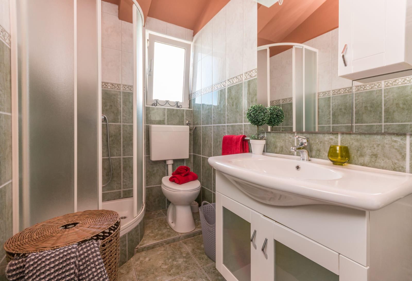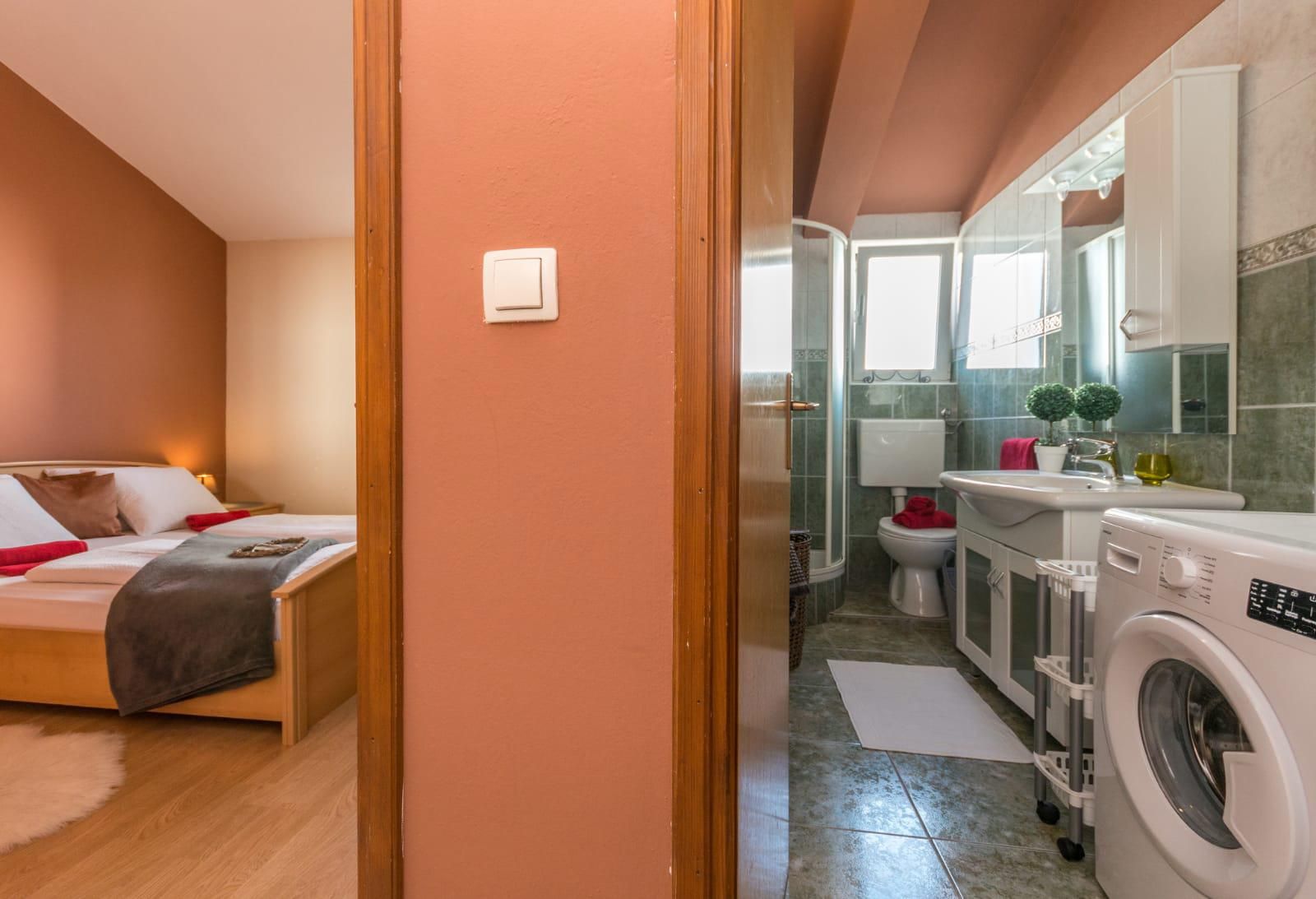 Das modern ausgestattete Badezimmer verfügt über eine Dusche, ein WC, ein Waschbecken, eine Waschmaschine, sowie ein Fenster für angenehmes Tageslicht und Frischluft.