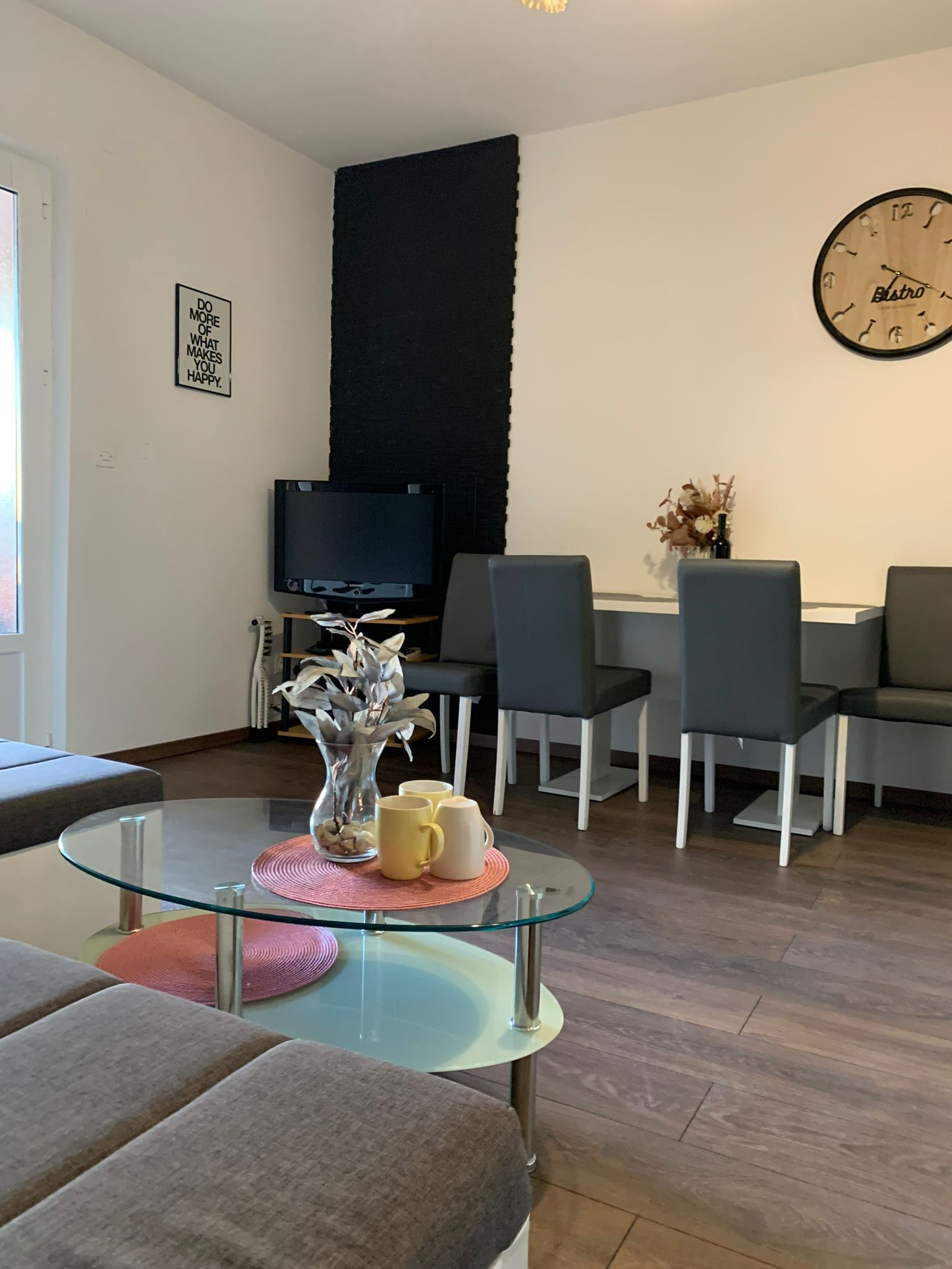 Der offene Wohn- und Essbereich lädt zum Verweilen ein: In der Sofaecke mit TV entspannen Sie nach einem erlebnisreichen Tag, während der Esstisch mit vier Stühlen Raum für gemeinsame Mahlzeiten bietet. Das Schlafsofa lässt sich bei Bedarf ausziehen und schafft zwei weitere bequeme Schlafplätze.