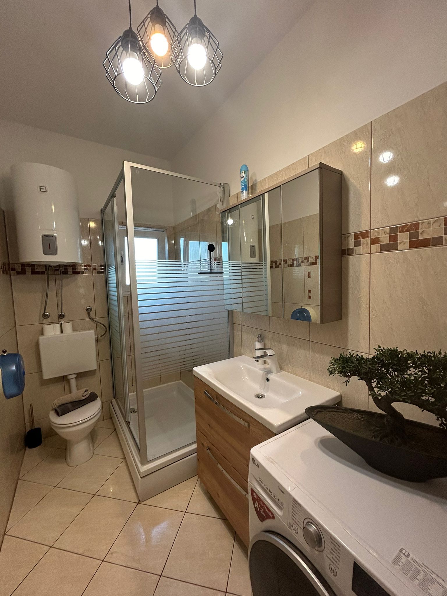 Das moderne Badezimmer bietet alles, was Sie für einen angenehmen Aufenthalt benötigen: Dusche, WC, Waschtisch, Waschmaschine und viel Tageslicht.